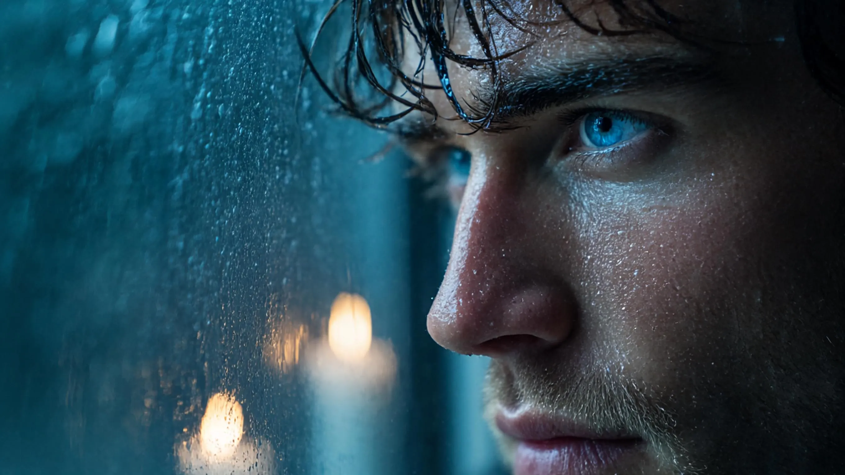 A man with striking blue eyes gazes out a rain-soaked window. His wet hair sticks to his forehead as he watches the torrential downpour outside. The window reflects the faint glow of candles, casting a soft light that contrasts with the dark, rainy night.