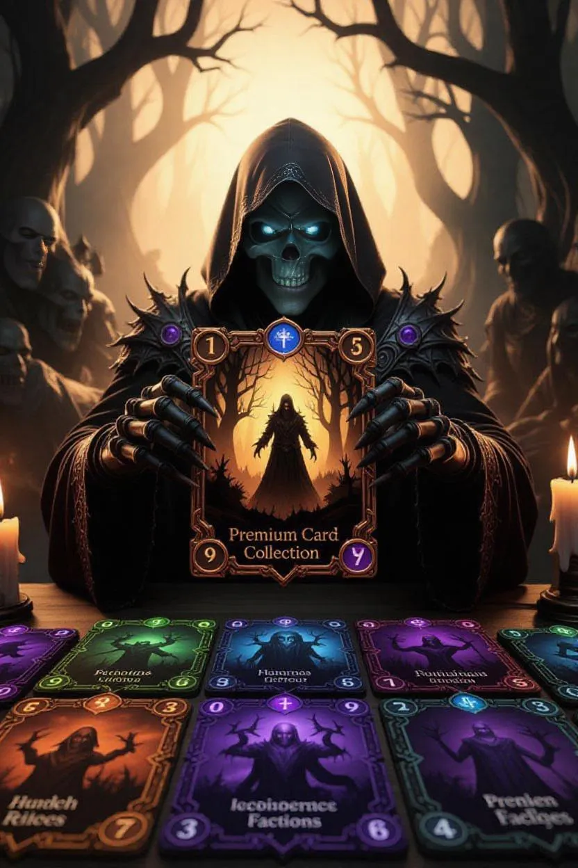 A player unveiling a rare, eerie 'Premium Card Collection' card game set in a fantasy horror realm, with ghastly creatures and ominous spells swirling around, as golden light filtering through a haunted, mystical forest casts an otherworldly glow on the cards, showcasing eight distinct factions, each associated with a specific color and mana/energy cost, while mysterious runes and ancient symbols adorn the card borders, imbuing the scene with an aura of mystique and foreboding, shot in a cinematic, low-angle view.