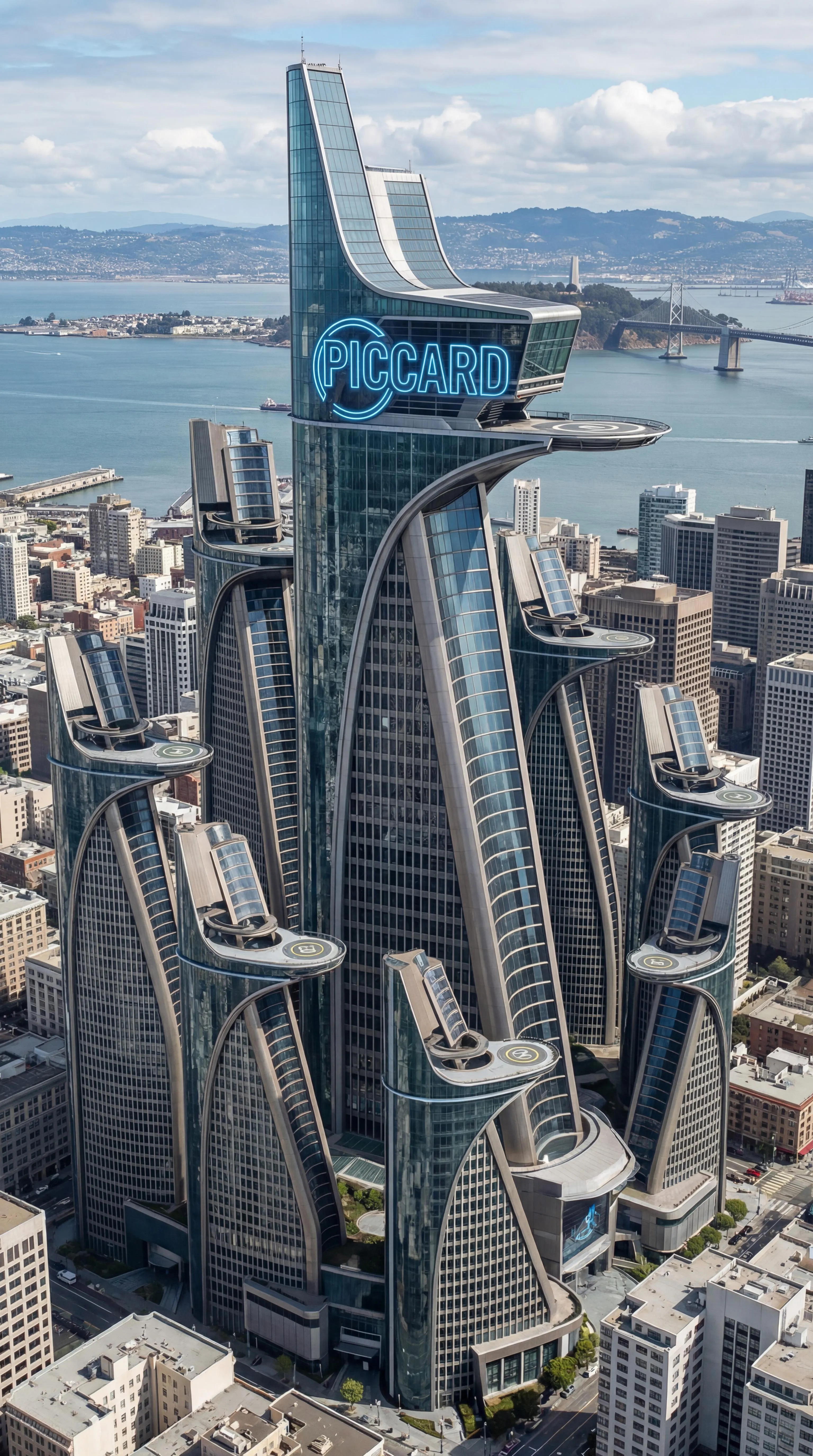 Discover the Piccard Watchtower Complex in San Francisco! This hybrid skyscraper merges MCU's iconic Avengers Tower and Stark Tower. Features distinct Quinjet pads, Iron Man landing platforms, and a towering 104-story main building surrounded by eight others. Sleek, futuristic architecture crowned with a prominent "Piccard" neon sign. Explore AI-generated Marvel-inspired cityscapes.