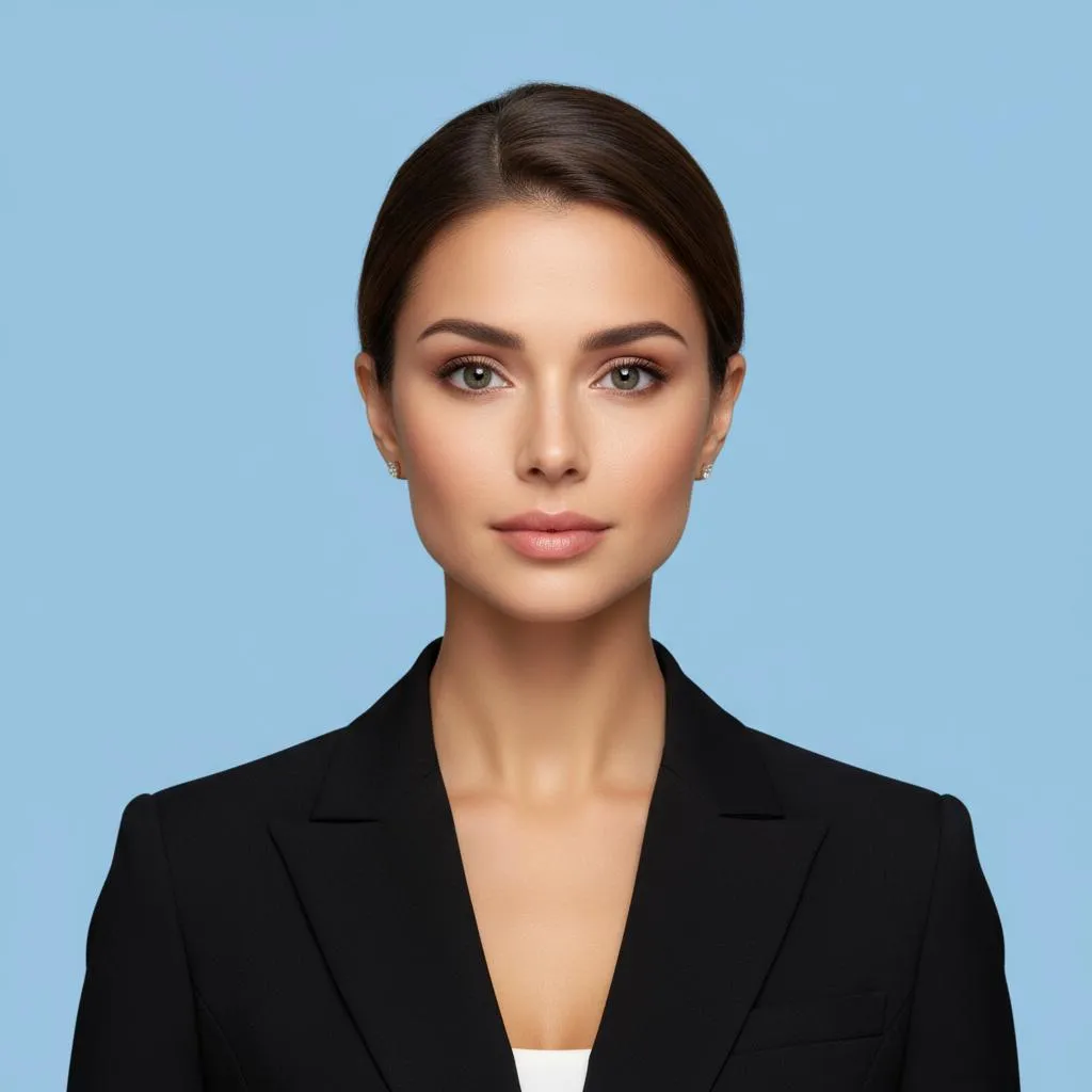 "Create a professional ID photo from the reference image. Crop to show only the head and upper shoulders of the person, centered in the frame. Use a solid blue background (passport/ID photo style).Character wearing black suit Ensure proper lighting, clear facial details, and natural skin tone. The output should look like an official ID photo with no extra decorations or shadows."