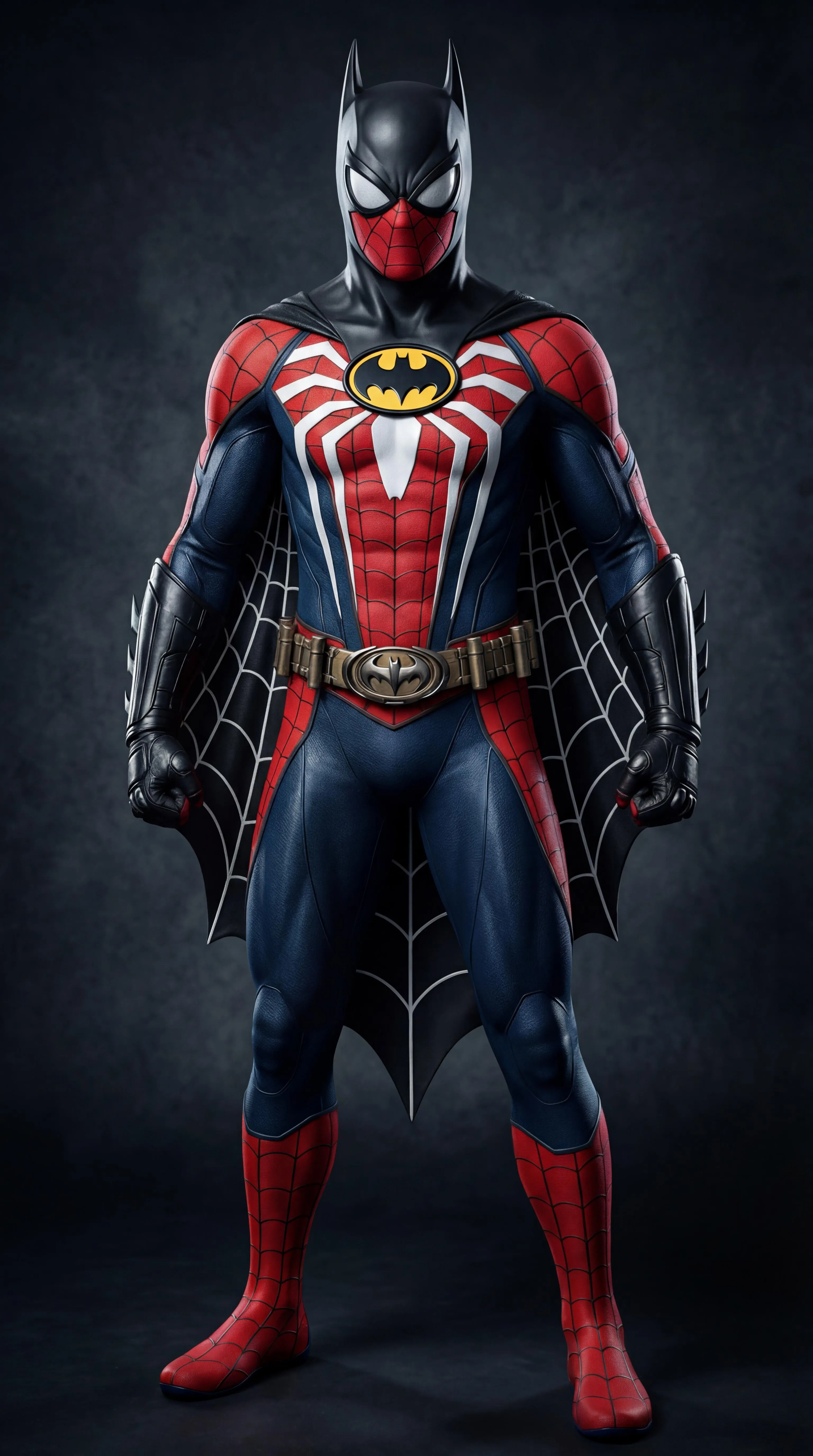 The Insomniac Spider-Man (voiced by Yuri Lowenthal) and Batman (portrayed by Michael Keaton, Val Kilmer, and George Clooney) interchangeably combine into each other as one to become Spider-Bat. The eye slits on Spider-Man's masks are in place of the eye holes on Batman's masks. The mouthpieces of Batman's masks are replaced by the lower parts of Spider-Man's masks. The front spider logos on Spider-Man's two suits are combined and merged with the front bat logos on Batman's two suits as one to form a spider-bat logo on the chest of the shirt. Batman's cape is instead split underneath his suit's arm pits like bat wings with white spider webs like Spider-Man's makeshift web wings. The utility belts on Batman's suits are combined and included. Spider-Man's shirts come with Batman's gloves. Batman's pants come with Spider-Man's boots.