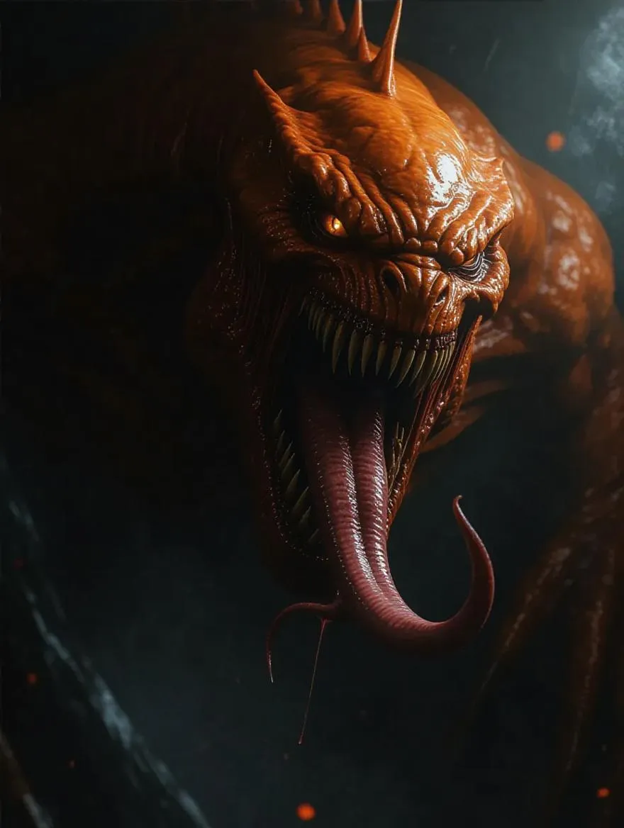 Generate eerie orange creature visuals with a bloodthirsty jaw and long tongue using Vivago.ai's powerful AI image generator. Create professional, gloomy monster art from text prompts and reference images with our advanced AI visual tools.