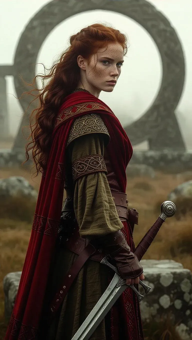 Craft a Celtic Warrior Female with vibrant red hair in earthy woolen garments, standing vigil at a mystical stone circle at dawn. Misty morning atmosphere, clutching a sword with intense gaze. Blends Frank Frazetta's heroism, Moebius' atmospheric lighting, and Kinuko Y. Craft's intricate textures for a mystical AI-generated fantasy scene.