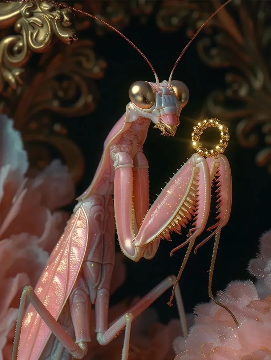 A highly stylized portrait of a pink mantis, shimmering in soft blush, coral, and iridescent rose tones, with delicate textures like porcelain and velvet. The mantis is regally posed against a dark, painterly backdrop, its forelegs gracefully raised, one claw delicately holding a luminous golden ring. Subtle highlights on its limbs and jewel-like eyes add depth, evoking baroque insect portraiture. The composition blends natural anatomy with symbolic mystery, creating an otherworldly and ceremonial image, a fusion of entomology, fantasy, and fine art.