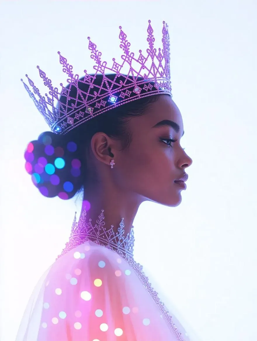 Generate stunning 8K AI art of a crowned lady universe with vivid colors, ethereal lighting, and symbolic secret meaning. Explore minimalist white backdrop, intricate details, and smooth light contrasts for mesmerizing high-resolution visuals. Perfect for professional-grade AI effects and creative projects on VivaGo.ai.