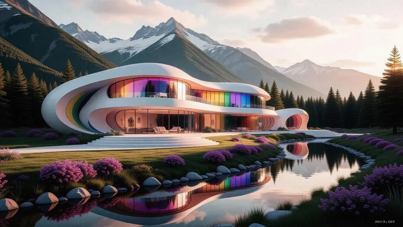 Discover AI-generated luxury with this serene, modern white futuristic house glowing in rainbow hues. Minimalist design meets nature’s grandeur: glass windows reflect rivers, mountains, and golden sunset magic. Elevate creativity with Vivago.ai’s tools for awe-inspiring, harmonious visuals blending sleek architecture and tranquil landscapes. Perfect for visionary art, ads, or immersive storytelling.