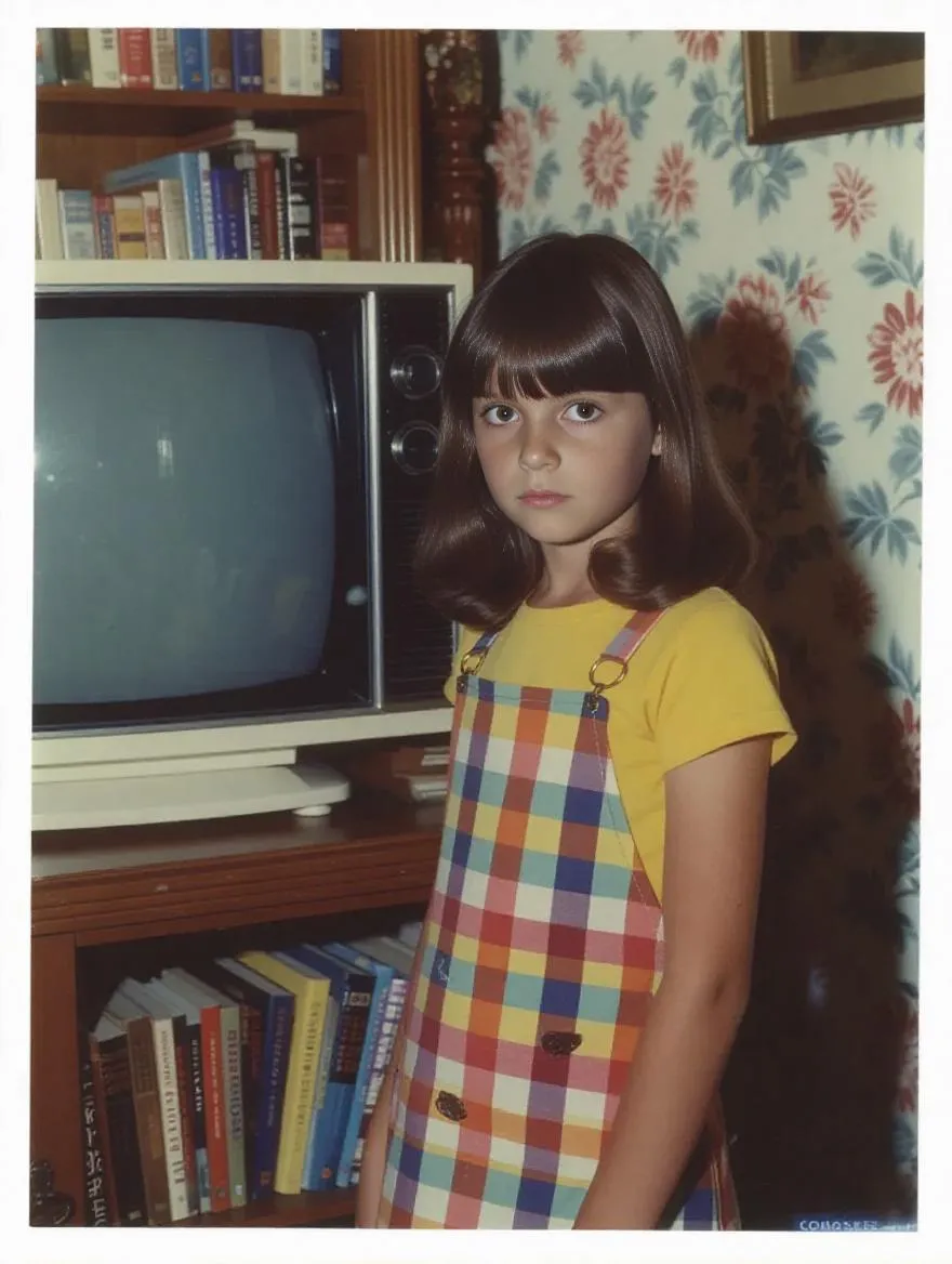 polaroid photo with sci-fi room in googie style, 70's ,sweet little girl in a naked apron poses next to tv and bookshelf. grains dots static. flirty COLORS: silvery white, dark blue, acid yellow, maroon blur