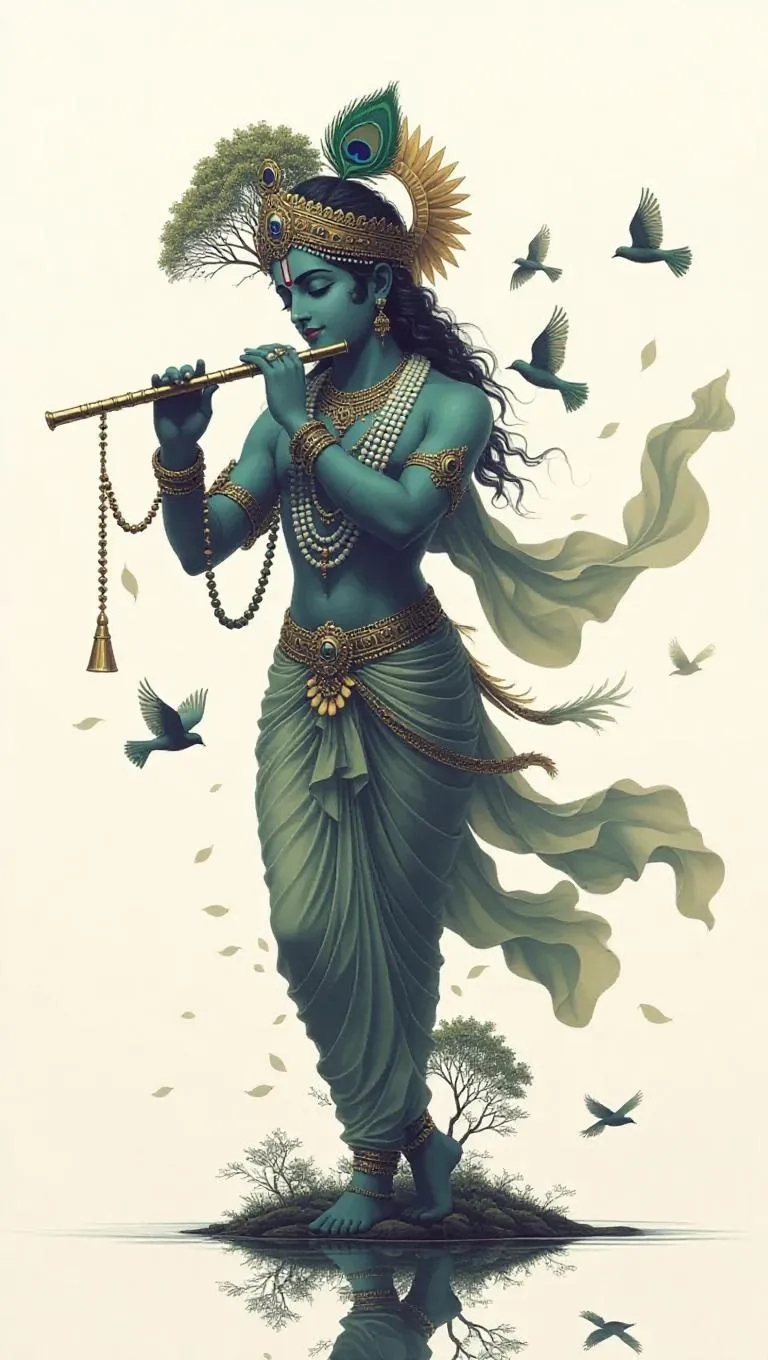 AI-generated visionary art of Lord Krishna merging with nature, flute notes transforming into trees, rivers, and birds. Explore metaphysical themes and divine harmony through surreal, abstract imagery with vivago.ai's AI effects.