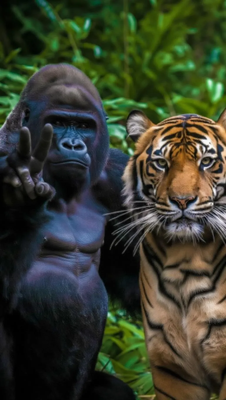 Generate an AI-powered image of a playful gorilla and tiger making peace signs in a lush jungle. Capture spontaneous interaction with casual framing, soft-focused backgrounds, and dynamic movement for an authentic, amateur-style visual. Perfect for creative storytelling or quirky content with a laid-back, unpolished vibe.