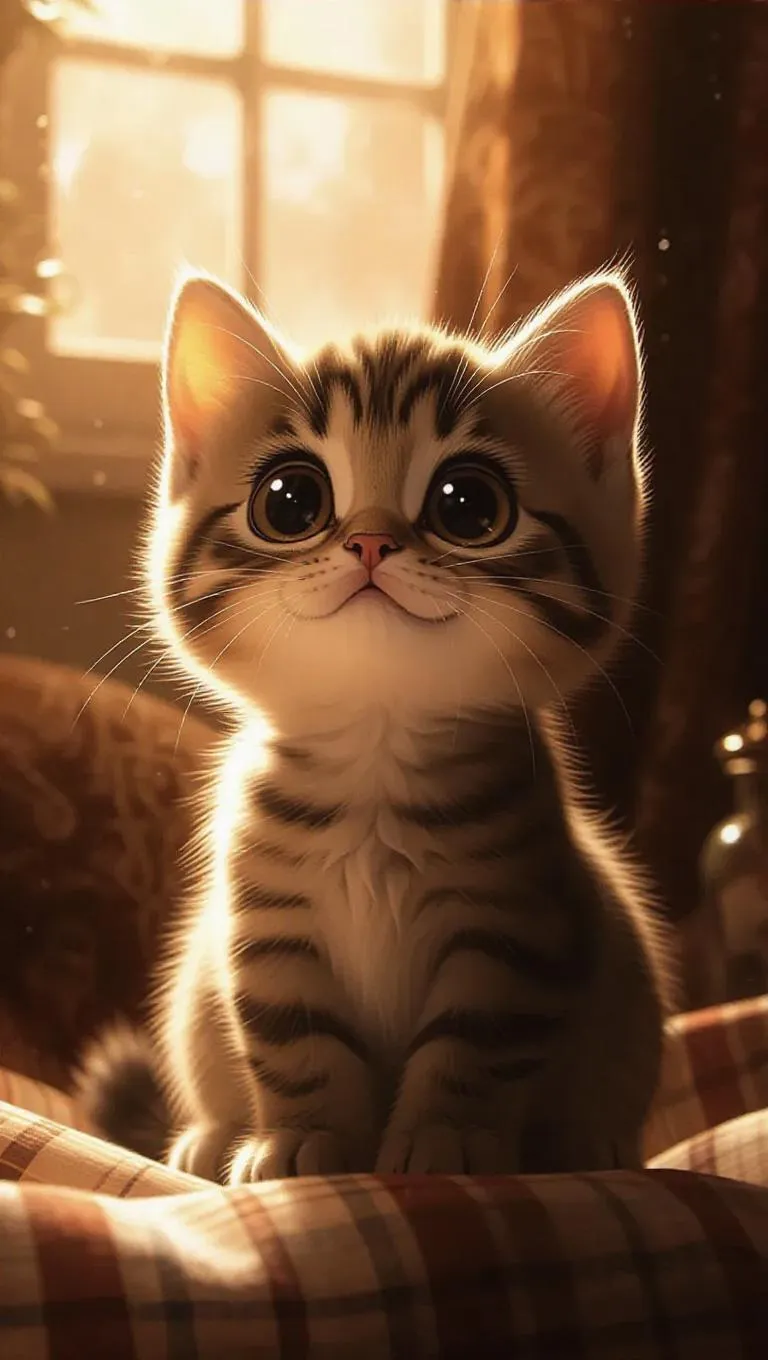 Create an AI-generated image of a charming cat with big expressive eyes and a fluffy coat in a cozy indoor setting. Warm lighting enhances the whimsical yet realistic art style, using rule of thirds composition for balance. Close-up perspective highlights adorable features, blending playful whimsy with lifelike details for engaging visual storytelling.