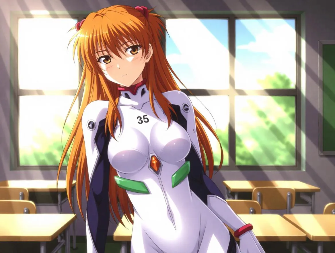 Create suggestive anime portraits of Asuka Langley Soryu from Neon Genesis Evangelion. Featuring a bandage-covered design in a classroom setting, dynamic posing, and creative light and shadow effects with gradients and flares. Generate stylish character art effortlessly.