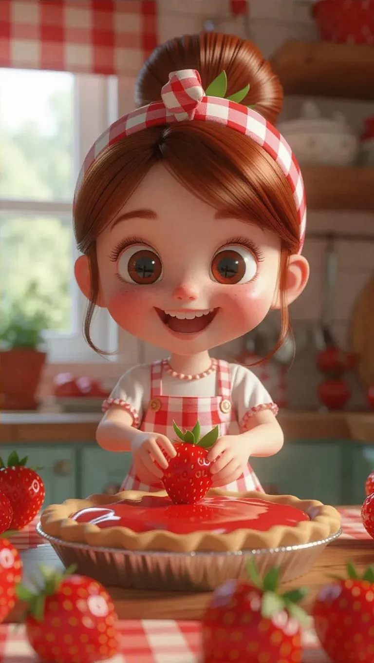 Create 3D cartoon character happy strawberry girl, baking a pie