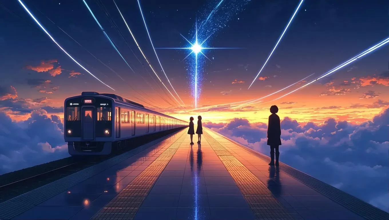 Generate breathtaking AI anime art of a celestial train platform at twilight with starry skies, meteor trails, and ethereal reflections. Inspired by Makoto Shinkai's radiant cinematic style, this AI-powered scene blends watercolor aesthetics with dramatic wide-angle perspectives for stunning visual storytelling. Transform your vision into vivid, dreamlike animations.