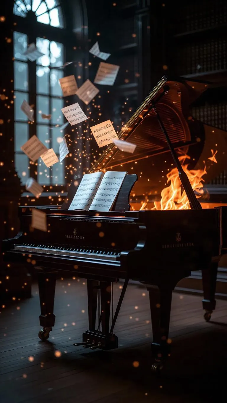 Text to ImageA concert piano burning in an old library, strings bursting with bright sparks, sheet music pages evolving into serene ash butterflies. Strong chiaroscuro lighting, dreamy ember particles gently floating.Recreate