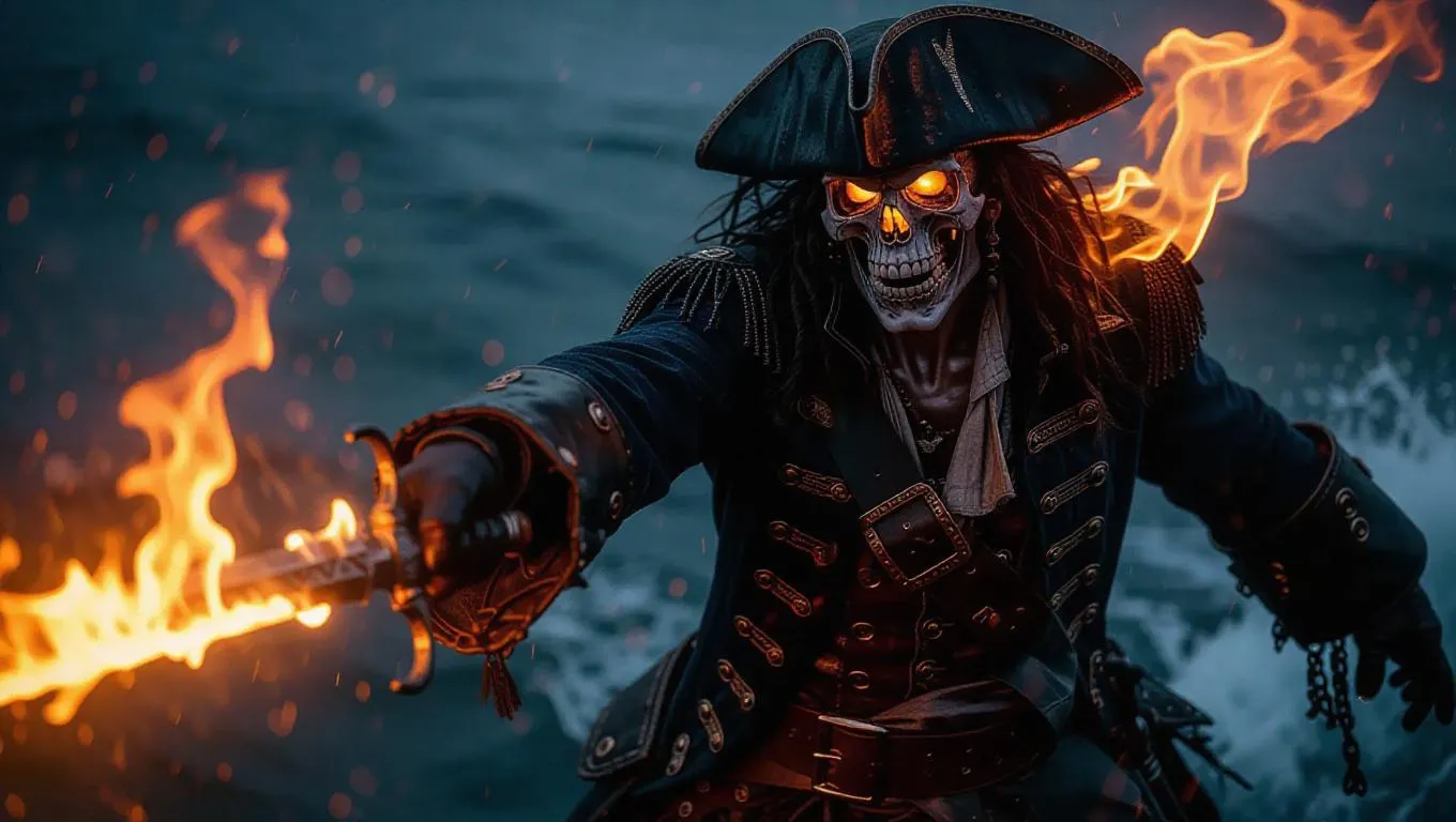 Text to ImageA tragic figure of a pirate with a flaming skull, his weathered coat shimmering with embers, wielding a blazing cutlass, spectral flames engulfing the stormy brine, visually engagingRecreate