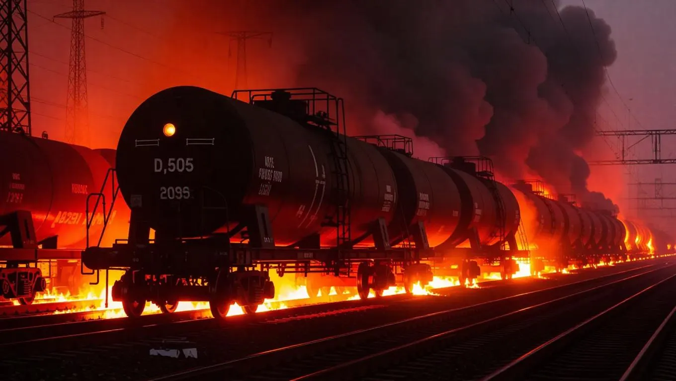 A train derailment has turned a once-bustling railway into a fiery nightmare. The train cars, laden with chemicals, are now engulfed in flames. The metal screeches and groans as the fire consumes them. The tracks themselves are glowing red-hot, as if they are about to liquefy. The surrounding industrial area is also on fire, with flames spreading rapidly. The hazy sky is illuminated by the intense light of the fire, casting an apocalyptic glow over the scene.