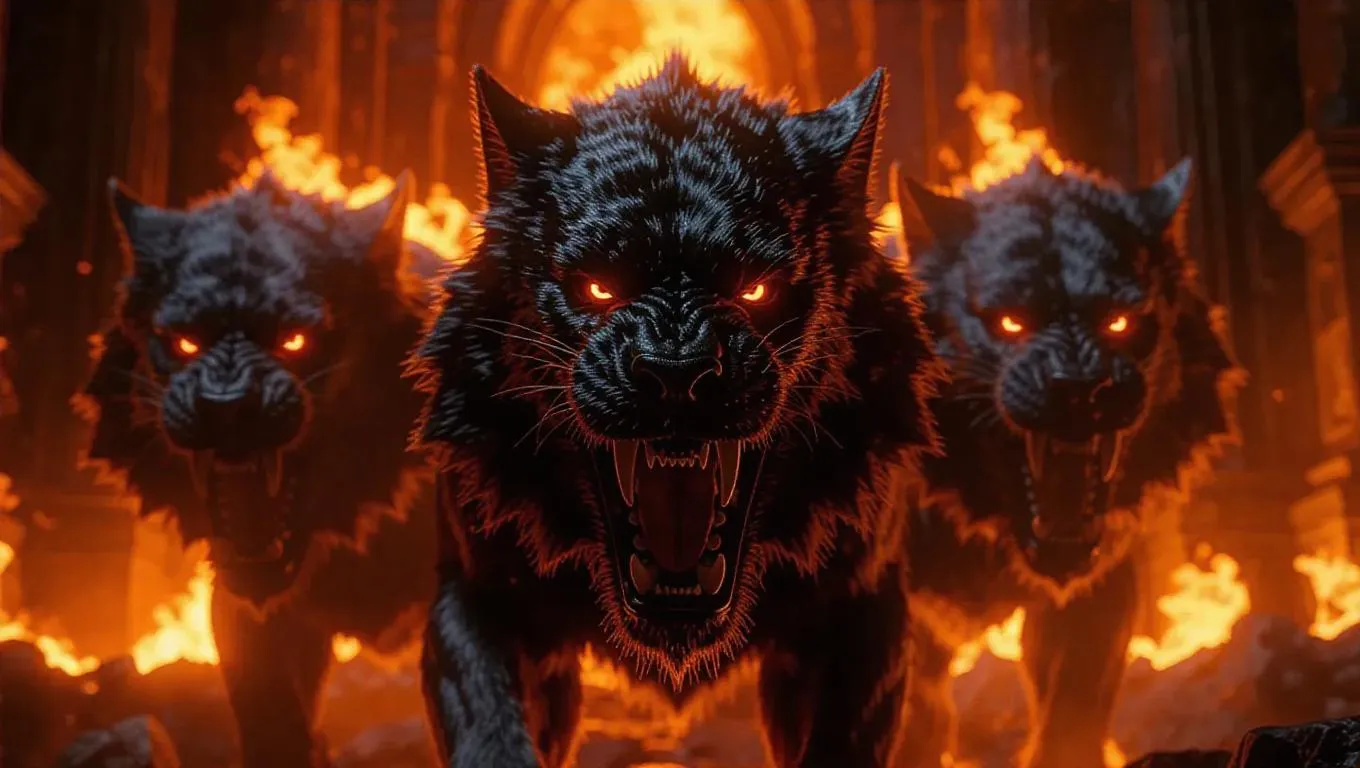 Text to ImageA savage three-headed Cerberus with fur made of raging flames, each head spewing fire as it guards the obsidian gates of the underworld, intense lighting, hyper-realistic texturesRecreate
