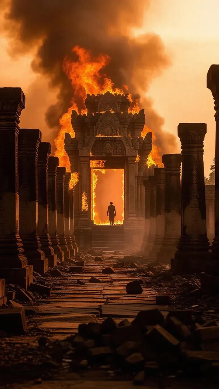 An ancient temple ablaze, with flames consuming everything in their path. Stone columns are reduced to charred ruins, and the ground is littered with ash and shattered relics. Pilgrims flee in terror, their cries echoing through the smoky air. The camera follows the fire's relentless advance, capturing the raw power and devastation of the blaze. The sound of roaring flames and collapsing stone creates a haunting and immersive experience.