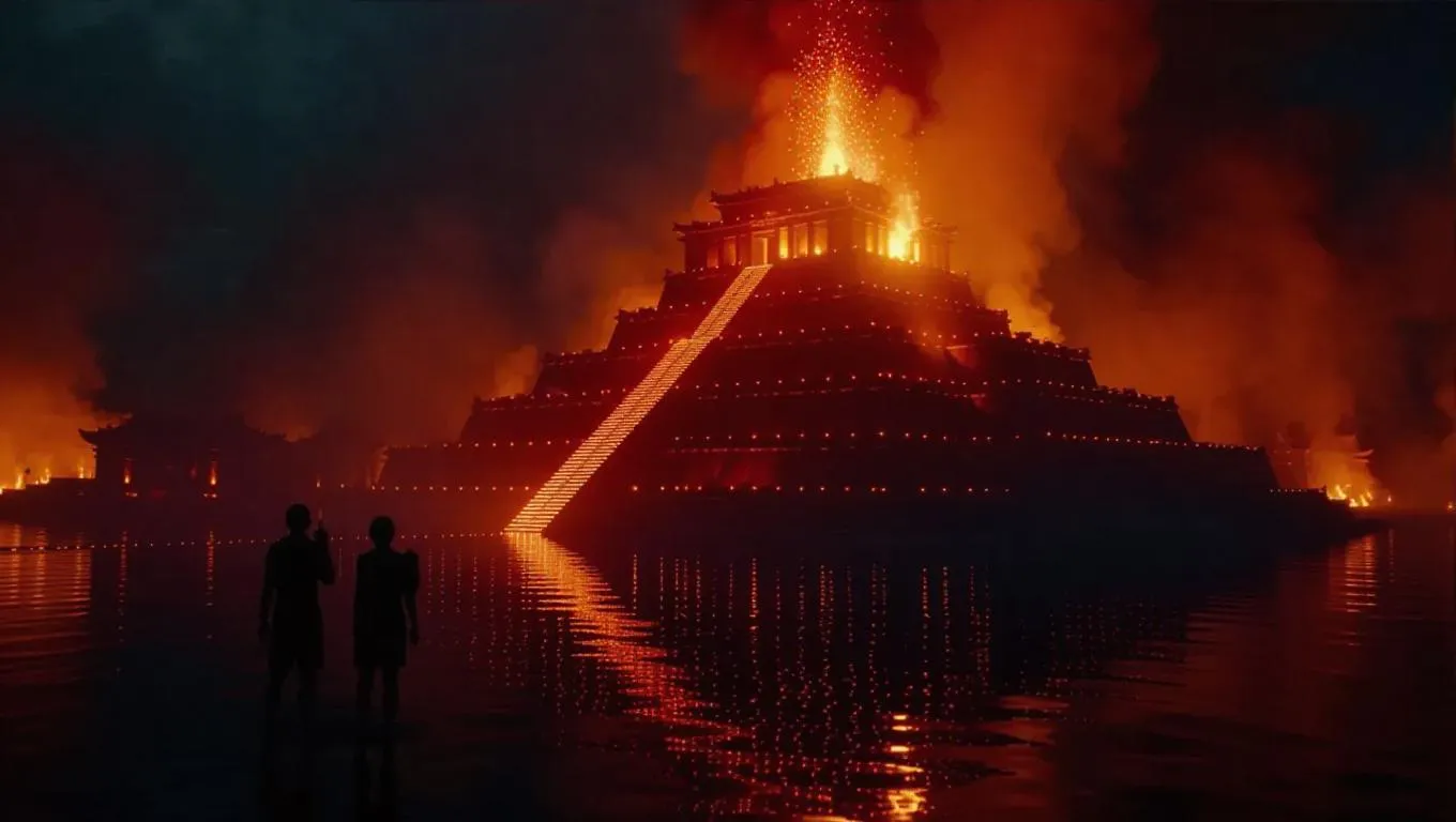AI archaeologists reconstructing Atlantis from volcanic dust holograms, every eruption portraying the city’s final moments in shimmering fire. Lidar-harvested aesthetics accompanied by traditional Asian brush flames.