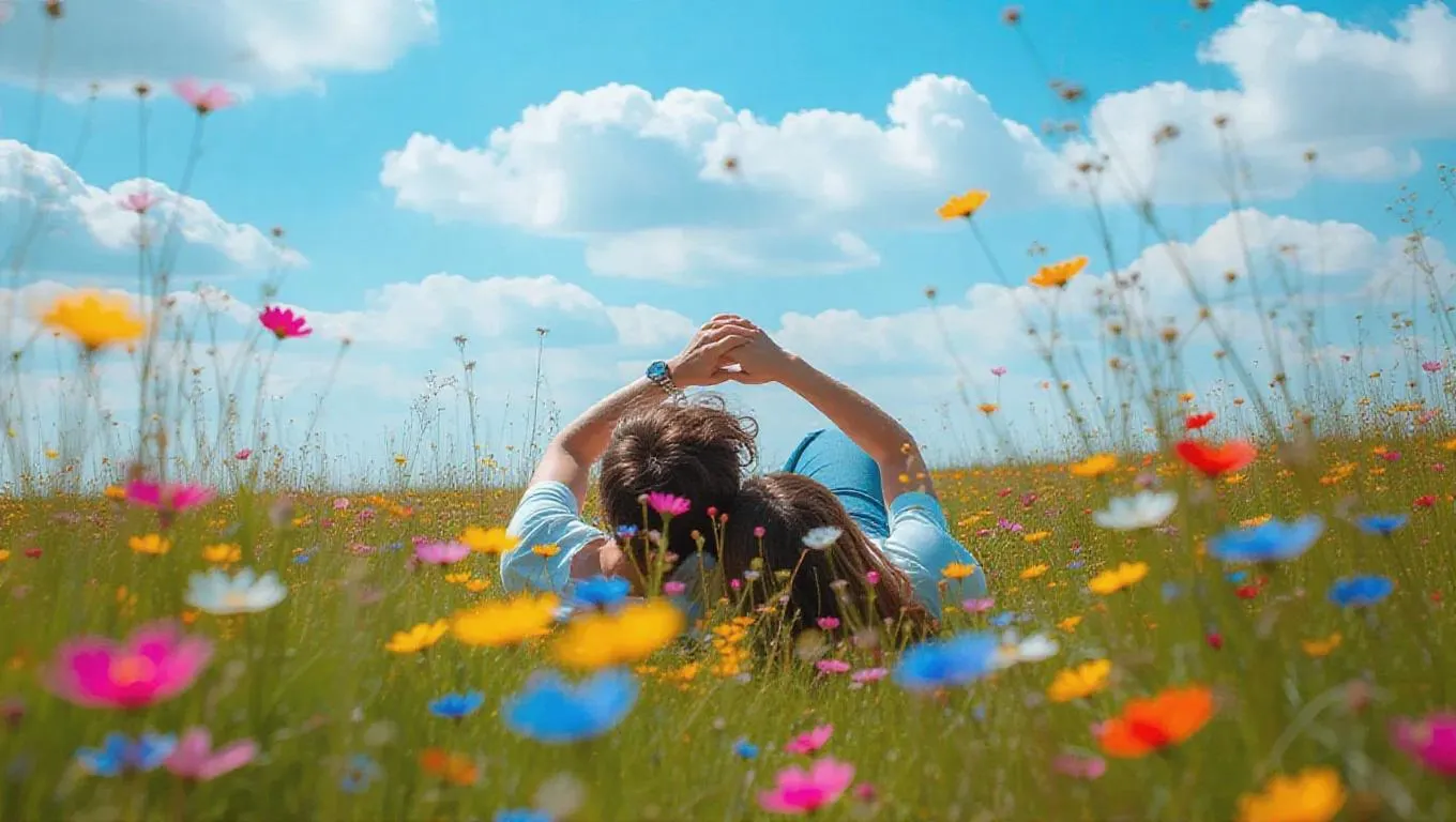 Create a serene, romantic scene with AI-generated visuals of a lush meadow filled with vibrant wildflowers. A couple lies peacefully, gazing at the sky, capturing love and nature's beauty in a tranquil moment. Perfect for storytelling, art, or personalized content.