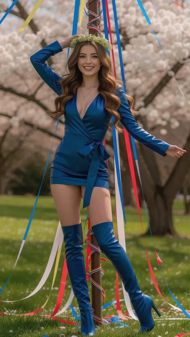 Create stunning AI-generated visuals of a fashionable woman in a cobalt leather mini dress with a high slit, twirling near a traditional Maypole. Featuring thigh-high boots, a flower crown, and auburn hair, amid blooming cherry blossoms and fluttering streamers. Transform ideas into professional images with AI effects and editing tools.