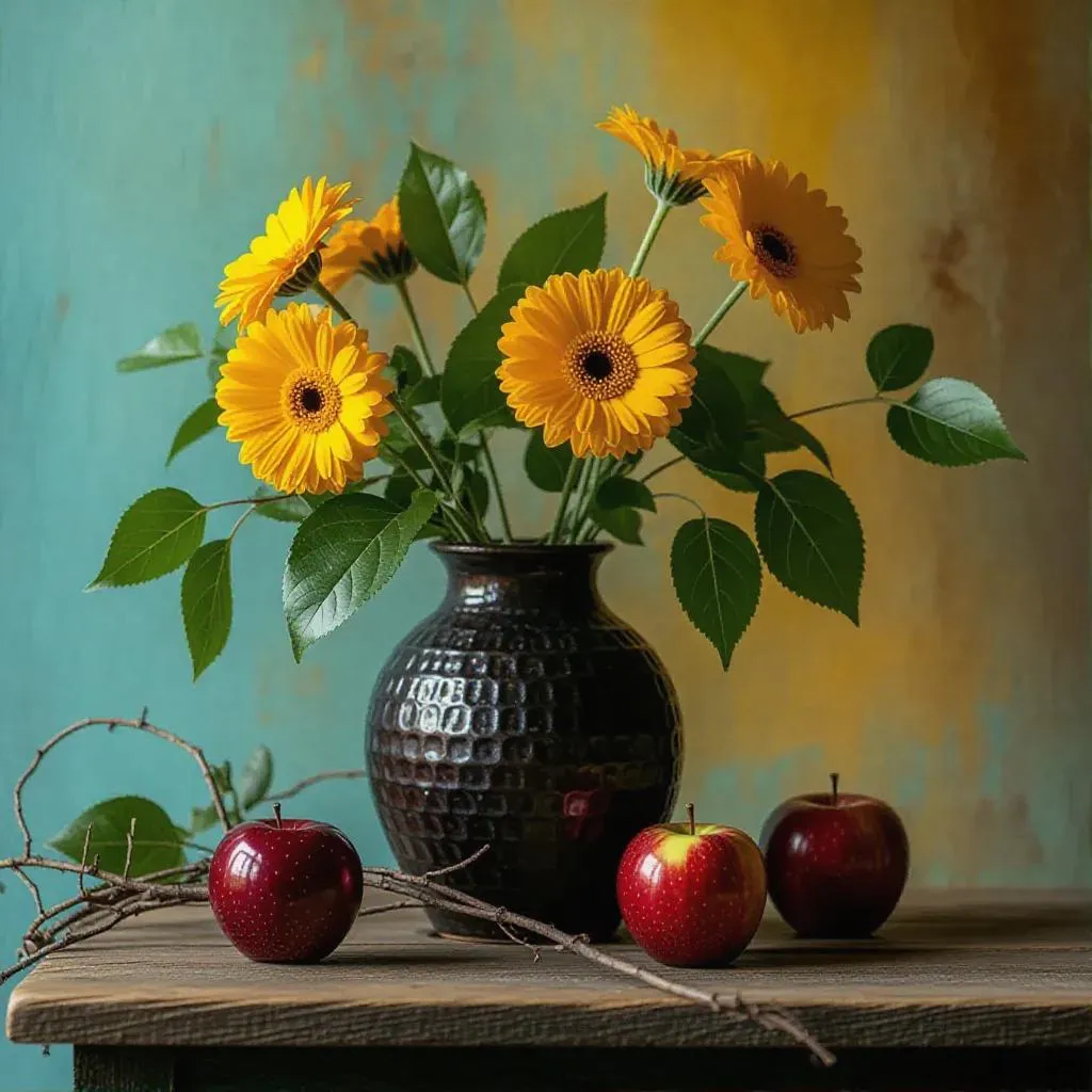 Vivago.ai's Retro Colors effect transforms prompts into vibrant 19th-century-style still lifes. Generate focal compositions with rustic vases, yellow gerberas, red apples, and textured multicolored walls using global illumination. AI-powered tools recreate warm earthy tones and full-length shots for professional retro visuals.