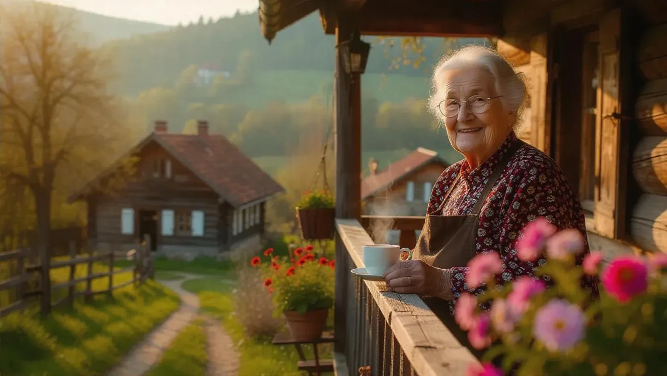 Charming old cottage nestled in a quaint Hungarian village. A smiling, bespectacled granny enjoys her coffee on the sunlit porch, surrounded by spring blooms. AI-generated imagery captures rustic charm and serene village life, perfect for storytelling or nostalgic visuals. Explore vibrant details with Vivago.ai’s creative tools.