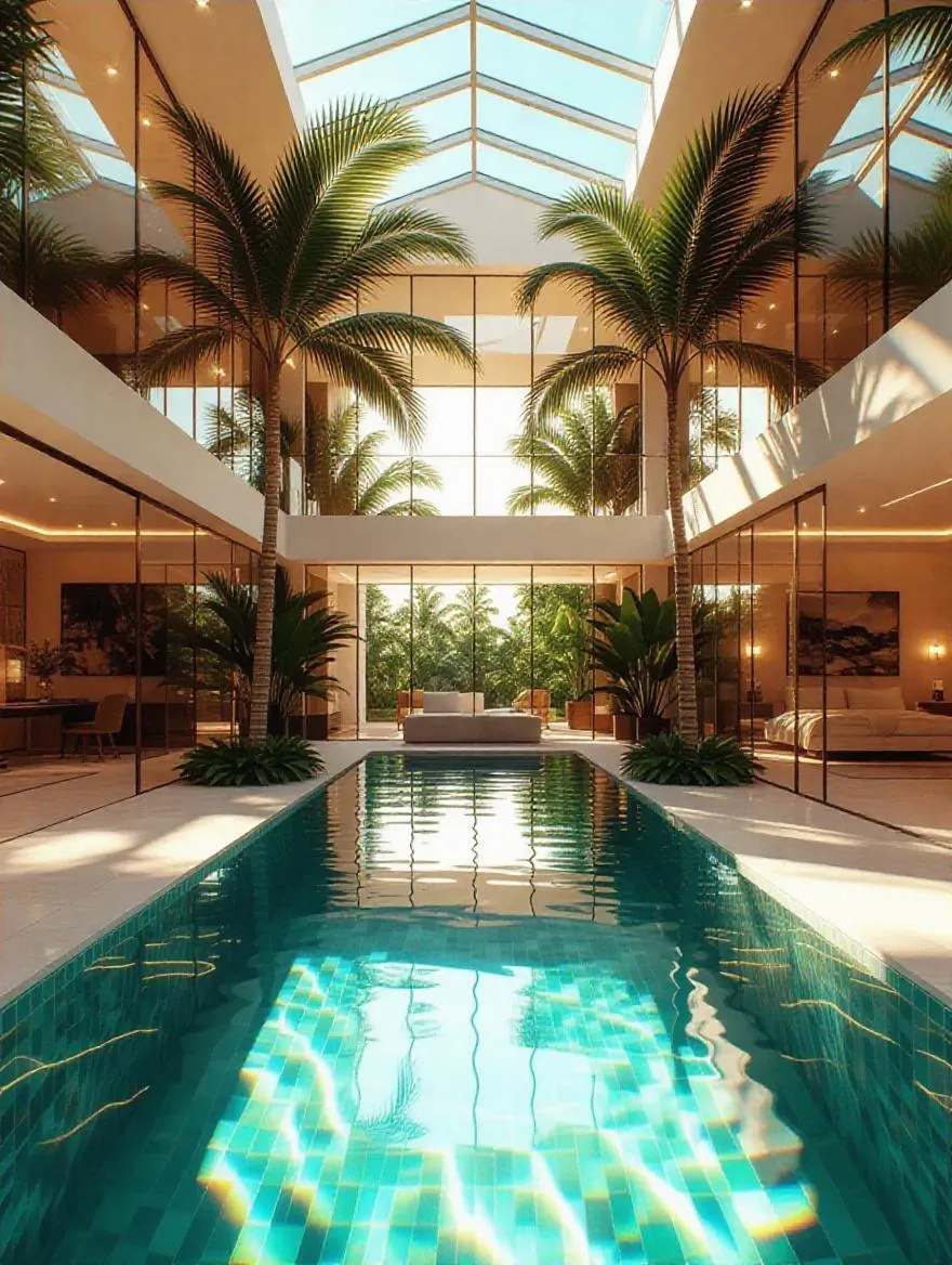 Luxurious mansion with indoor swimming pool, tropical oasis views, and kaleidoscopic rainbow reflections. Two-story design with glass walls, ceiling windows, lush vegetation, serene bedroom, and modern office. Real photography captures shimmering light effects, vibrant corridors, and inviting pool ambiance. Experience tropical elegance meets contemporary architecture in vivid detail.