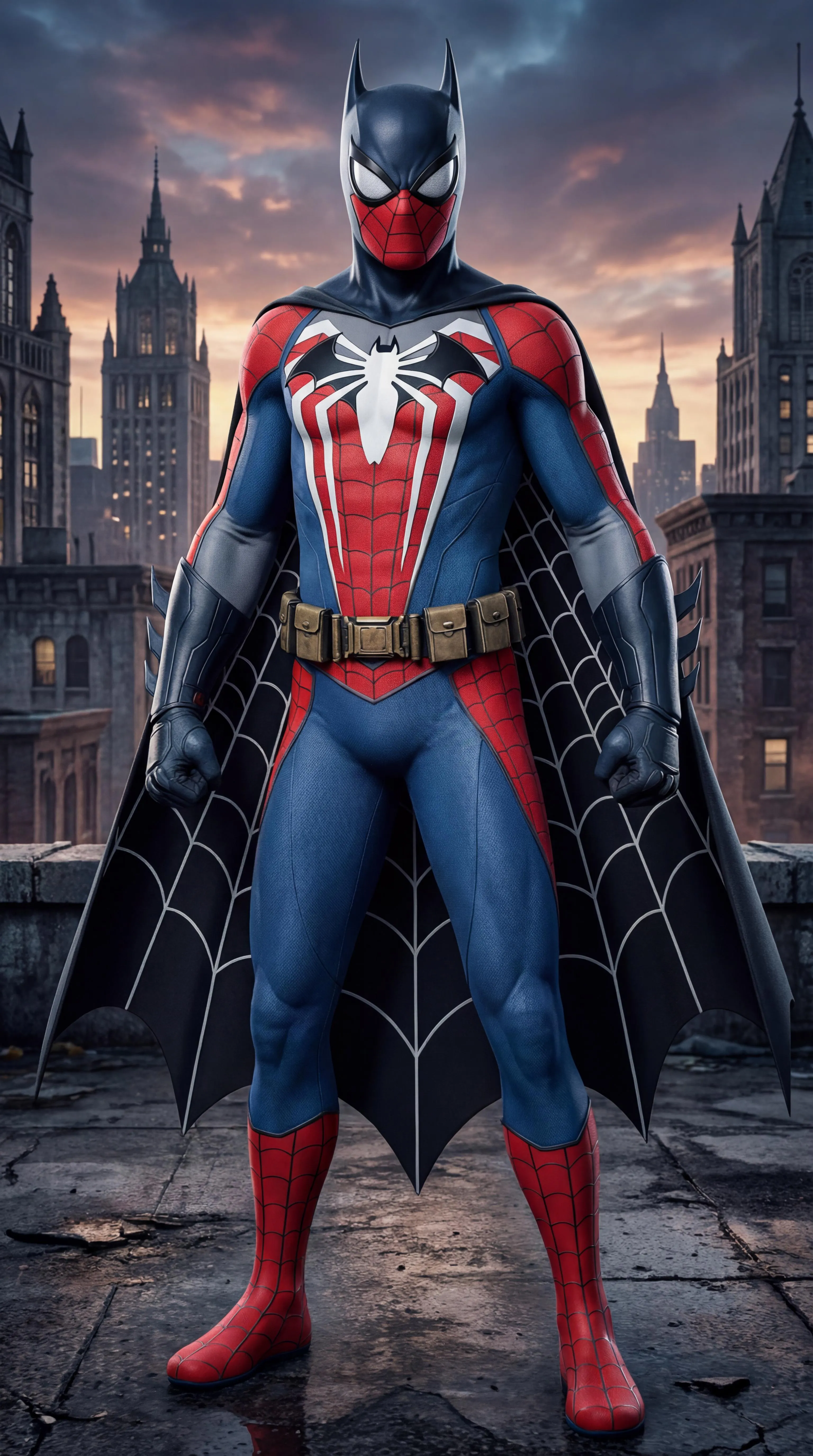 The Insomniac Spider-Man (voiced by Yuri Lowenthal) and Batman (portrayed by Lewis Wilson and Robert Lowery) interchangeably combine into each other as one to become Spider-Bat. The eye slits on Spider-Man's masks are in place of the eye holes on Batman's masks. The mouthpieces of Batman's masks are replaced by the lower parts of Spider-Man's masks. The front spider logos on Spider-Man's two suits are combined and merged with the front bat logos on Batman's two suits as one to form a spider-bat logo on the chest of the shirt. Batman's cape is instead split underneath his suit's arm pits like bat wings with white spider webs like Spider-Man's makeshift web wings. The utility belts on Batman's suits are combined and included. Spider-Man's shirts come with Batman's gloves. Batman's pants come with Spider-Man's boots.