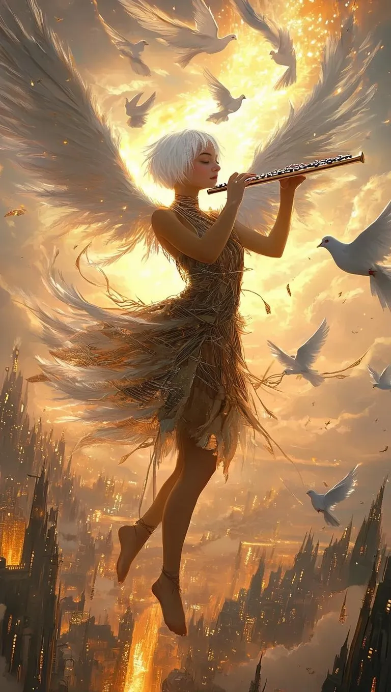 Create enchanting fantasy art with AI: a winged muse with feathered wings, musical stave attire, and a glass-ash flute. Feathers ignite into doves amid floating cities below. Warm, flowing lines and luminescent tones bring this celestial dancer to life. Perfect for fantasy visuals, AI-powered creativity, and luminous, ethereal designs.