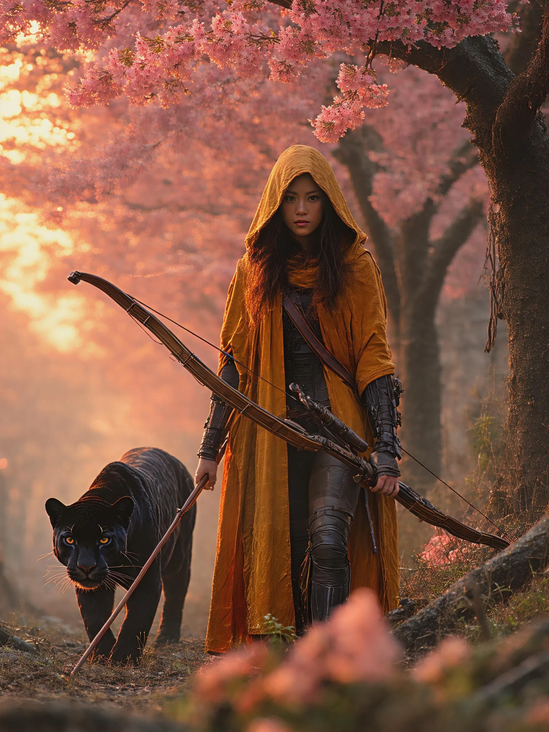 A candid photo of a forest guardian, longbow, amber cloak with her companion, panther, stalking, positioned in Tokyo Japan year 2190. The global catastrophe has ended, the urban wasteland has been overtaken by wilderness, it is filled with towering cherry blossom trees, warm color palette, sunset light, futuristic, medium shot, dramatic lighting, 85mm, Kodak, Cinemascope, widescreen, crisp focus, intricate details, 8k, HDR, lifelike, realistic, main visual, movie frame, cinematic color grading, shallow depth of field.
