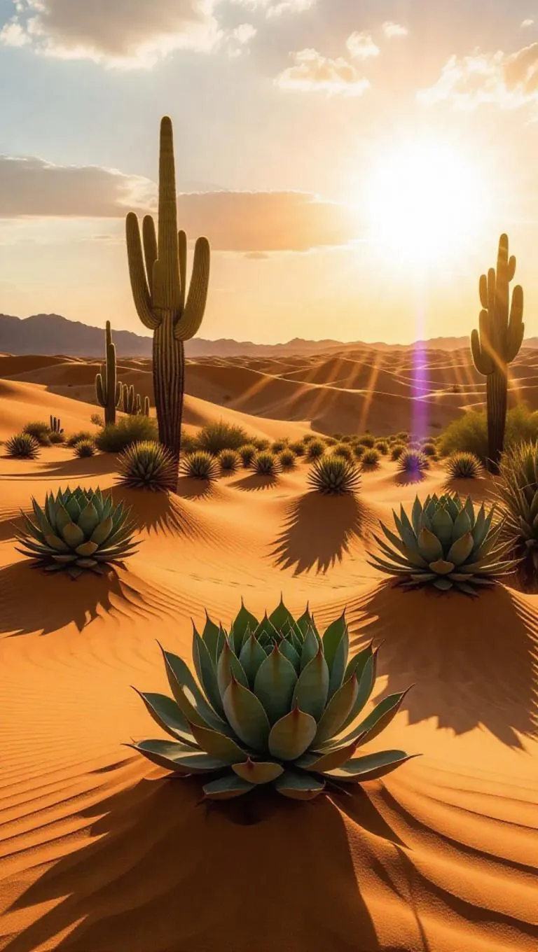 Vivago.ai transforms deserts into surreal wonderlands with AI-generated art. Create golden dunes bursting with prismatic succulents, fiery cactus blooms, and ancient bones sprouting obsidian flowers. Elevate visuals with professional AI effects for mesmerizing, vibrant landscapes from text prompts.