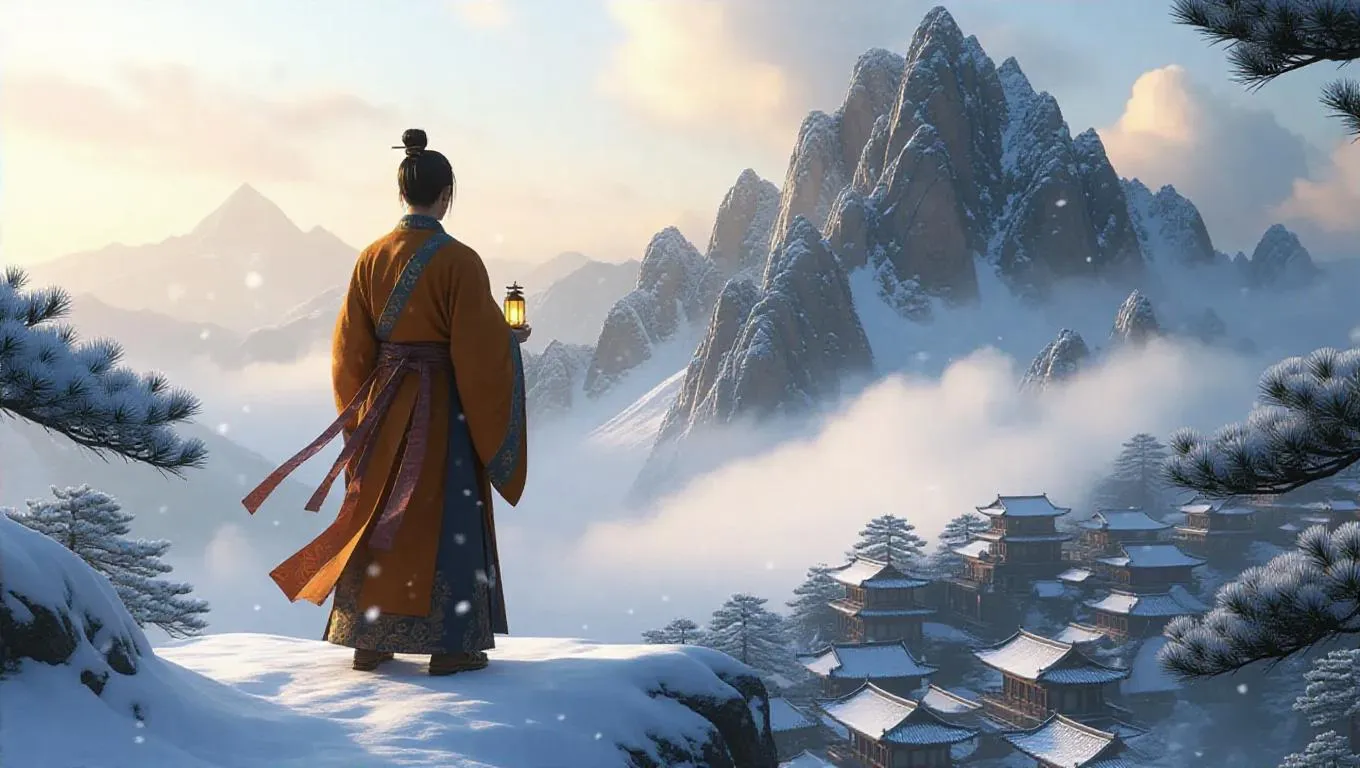Capture a serene ancient Chinese-style winter scene with a Tang dynasty poet gazing at snow-clad Mount Zhongnan. Anime-inspired lighting, dynamic robes, and delicate snowfall enhance this poetic landscape, featuring an ancient city, frosted pines, and a glowing lantern. Blend history, artistry, and tranquility in a timeless snowy tableau. #ChineseStyle #AncientArtistry