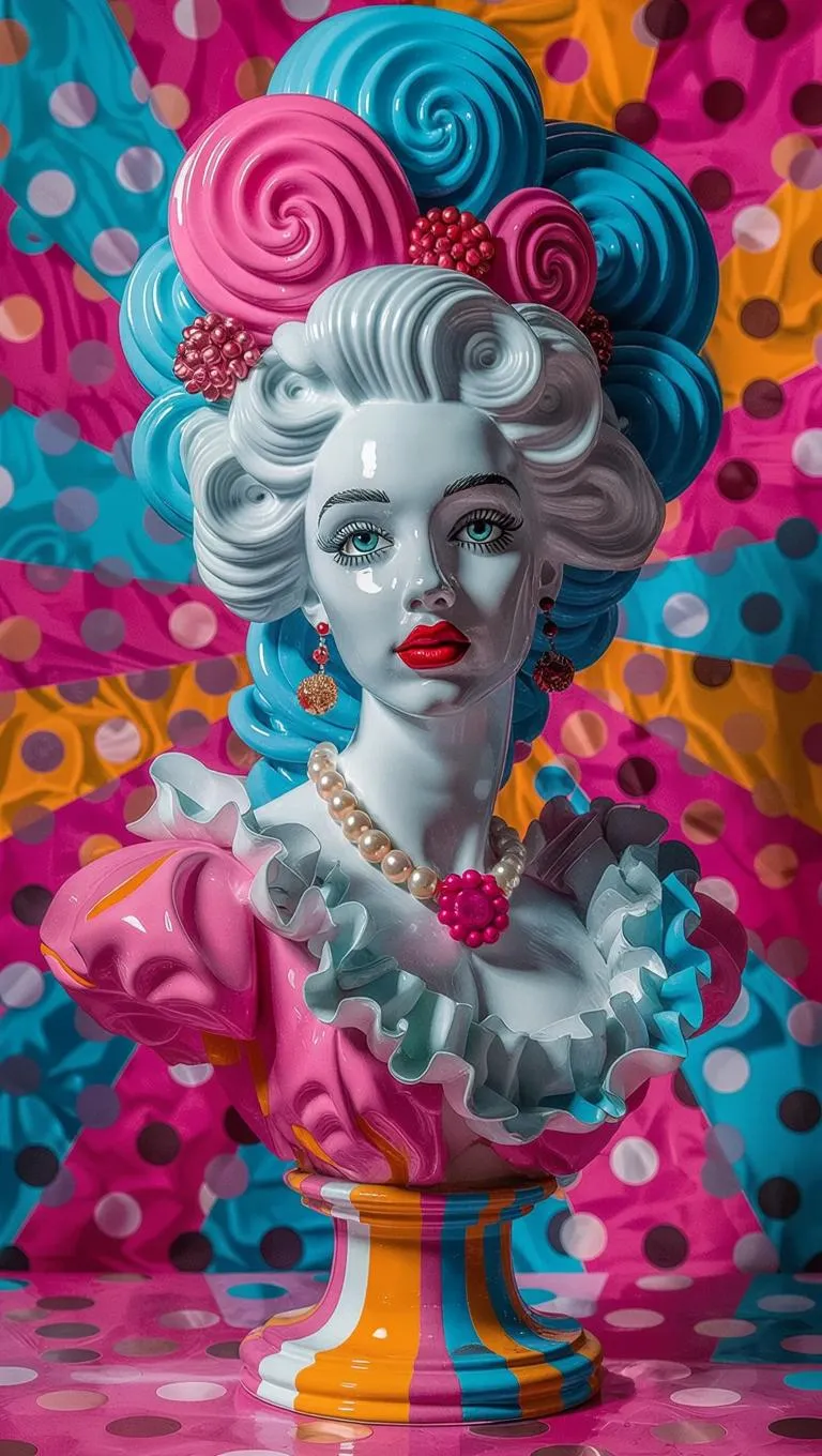 Bust of Marie Antoinette reimagined in vibrant pop art style — bold color blocks, exaggerated contours, and high-contrast highlights. Her powdered wig is rendered with graphic curls in bubblegum pinks and electric blues, adorned with surreal candy-like ornaments. The sculpture sits against a flat, saturated background with halftone textures and neon bursts, evoking a Warhol-inspired aesthetic. Eyes outlined with thick black lines, lips in glossy crimson. The surface mimics a glossy ceramic finish with playful shadows and reflective accents. A fusion of regal elegance and rebellious modernity, meticulously detailed and visually striking. Ideal for high-definition artistic rendering.
