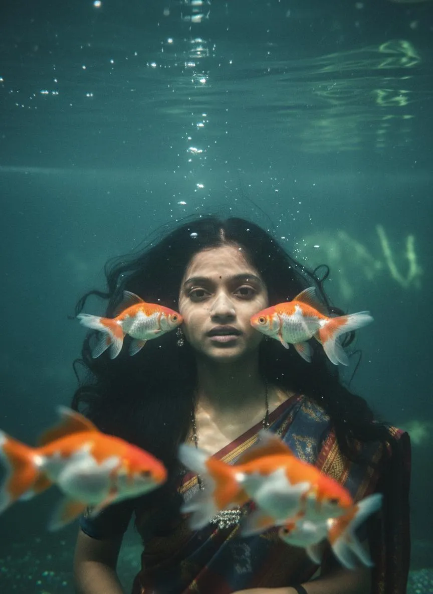 Underwater scene inside a large ecological fish tank, featuring the figure from the uploaded image (unchanged facial features, age and gender) with faint small freckles on the cheeks. Their hair floats and fans out in soft curls due to water buoyancy, with tiny water droplets clinging to the tips. Expression: Gaze fixed on the camera, lips slightly parted with a subtle breathy quality; eyebrows droop gently, conveying alienation and loneliness, with a taut jawline. Attire: Exquisitely tailored high-end summer couture, the fabric forming natural folds from water buoyancy, paired with sophisticated and delicate accessories. Composition: Close-up facial shot (the figure’s face occupies 80% of the frame). Multiple large orange-white/silver-white goldfish nuzzle the cheeks and circle the hair tips in an interactive way, with tiny air bubbles rising slowly beside the figure’s profile. Goldfish swim in the foreground with a blurred effect, and water ripples blur and smudge softly in the background. Shooting Angle: Eye-level close-up underwater perspective, with the lens positioned 3cm below the water surface to capture the broken light spots refracted by the water. Light & Shadow: Kodak Portra 400 film texture with fine yet distinct film grain and slight vignetting. Soft diffused cool cyan-green light filters through the underwater environment, with diamond-shaped light spots piercing through the water surface; weak light and shadow contrast yet gentle layered tones, with edges slightly blurred and smudged. Color Palette: A base of low-saturation dark tones (deep cyan + jet black + grayish green), accented by the warm orange-white/silver-white of the goldfish. A retro film tone with a subtle cyan-yellow cast, creating an overall hazy and lonely atmosphere, with striking contrast between light and shadow underwater.