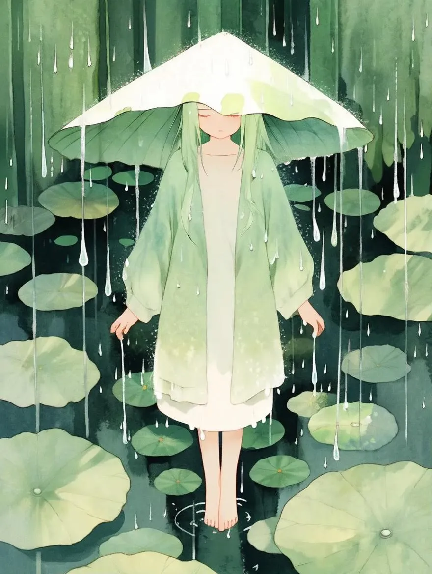 Capture a serene Studio Ghibli-inspired scene of a gentle girl with white-green gradient hair standing on lotus leaves in summer rain. Watercolor textures, flat-style outlines, and sage-green gradients blend with fresco-like backgrounds. Delicate raindrops, soft cardigan sleeves, and blue-gray tones evoke a healing, expressive mood—AI-generated tranquility merging Studio Ghibli charm and watercolor artistry.