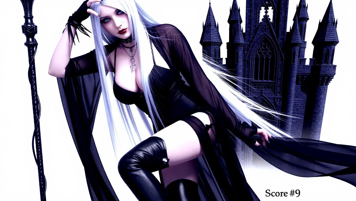 score_9, score_8_up, score_7_up, pale skin, long silver hair, gothic makeup, sheer black robe, ruined makeup, side slit, portrait, close-up, glowing eyes, dark castle, holding staff, leaning forward, thigh-high boots, looking at viewer, nipple pasties, underboob, solo, large breasts, elegant but provocative, dynamic angle, highly detailed, high contrast, film grain, 8k