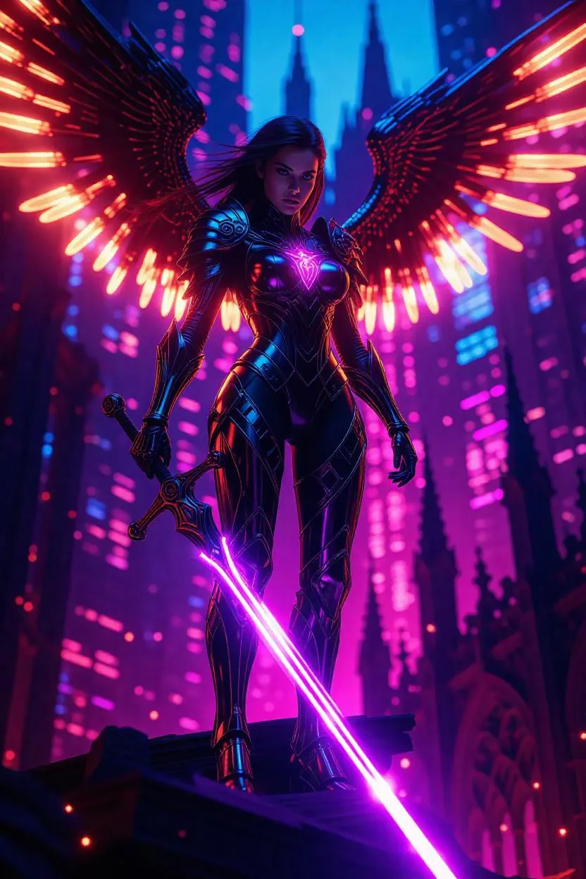 Generate a striking photorealistic image of a biomechanical Valkyrie warrior atop a ruined gothic cathedral, overlooking a neon cyberpunk city. Featuring intricate glowing circuitry, metallic wings, flowing copper hair, and a raised plasma sword. Evokes Ash Thorp & Stalenhag styles. AI creates this masterpiece digital art from text.