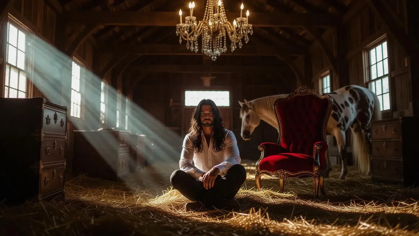Rustic barn interior, large ornate chandelier, sunlight filtering through windows, beams of light on hay-covered floor, beautiful man with long wavy black hair and blue eyes sitting on hay, antique furniture, red velvet throne with diamonds, chests, black and white spotted horse, mystical atmosphere, 8k resolution