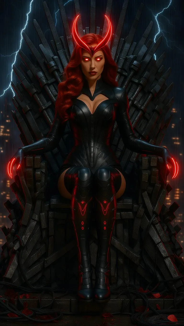Ultra photorealistic, 9:16 full body Scarlet Witch in cyberpunk style, levitating above a colossal techno-organic throne pulsing with crimson neon light and cables. She wears a black latex-tech armor suit with glowing red neon veins, impossibly tight, sculpted to her curves. Corset section deep V-cut, thighs strapped with glowing cybernetic garters connected to thigh-high latex boots etched with runes. Long armored gloves sharpen into cyber-claws, cables extend from her arms, waist and boots, glowing red, dangling like living tentacles feeding energy into the throne below. Her metallic neon horned crown blazes crimson, eyes radiating augmented chaos fire. A holographic torn cape of neon shards drifts behind her. Background: dystopian skyline fractured with crimson lightning, holograms flicker in rain. Pose: floating in dominion, arms raised, surrounded by swirling holographic chaos sigils. Cinematic neon glow, museum-grade cyberpunk erotic realism.