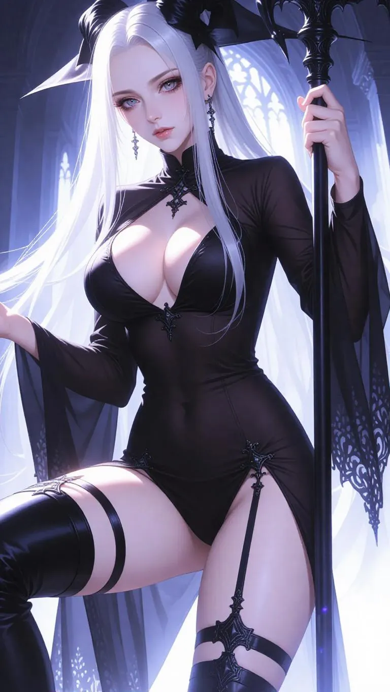 score_9, score_8_up, score_7_up, pale skin, long silver hair, gothic makeup, sheer black robe, ruined makeup, side slit, portrait, close-up, glowing eyes, dark castle, holding staff, leaning forward, thigh-high boots, looking at viewer, nipple pasties, underboob, solo, large breasts, elegant but provocative, dynamic angle, highly detailed, high contrast, film grain, 8k