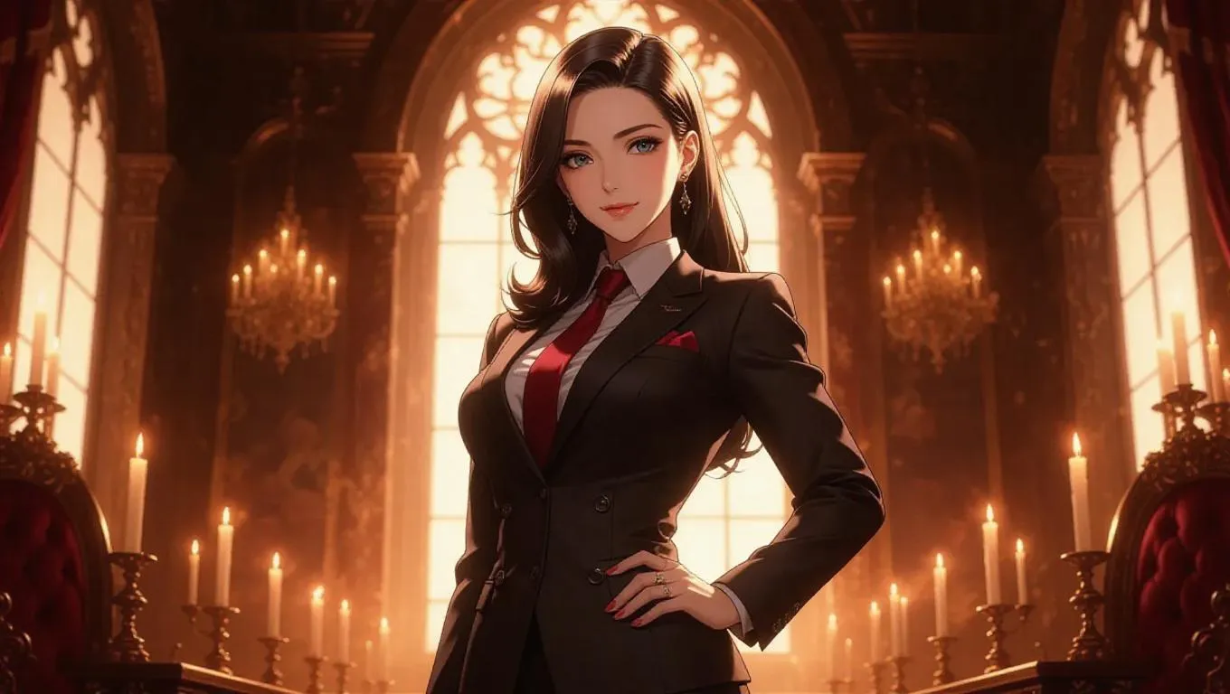 Fantasy realm animated anime hot mafia boss woman, married, exuding confidence and charisma, adorned in a sleek, dark suit with a crimson tie, standing in a dimly lit, opulent room filled with shadows and flickering candlelight, surrounded by lavish decor and intricate tapestries.