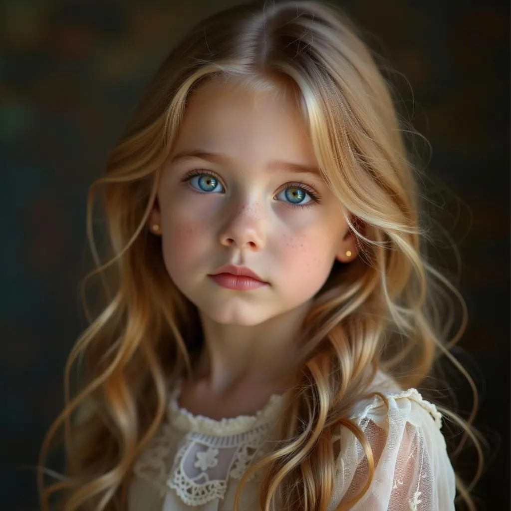 Transform text into a vivid, realistic portrait with artistic flair. Create a pensive 6-year-old girl in a vintage 1930s dress, featuring long pale gold hair and bright blue eyes. Achieve professional-grade, slightly stylized imagery with warm natural lighting to highlight unique beauty using AI.