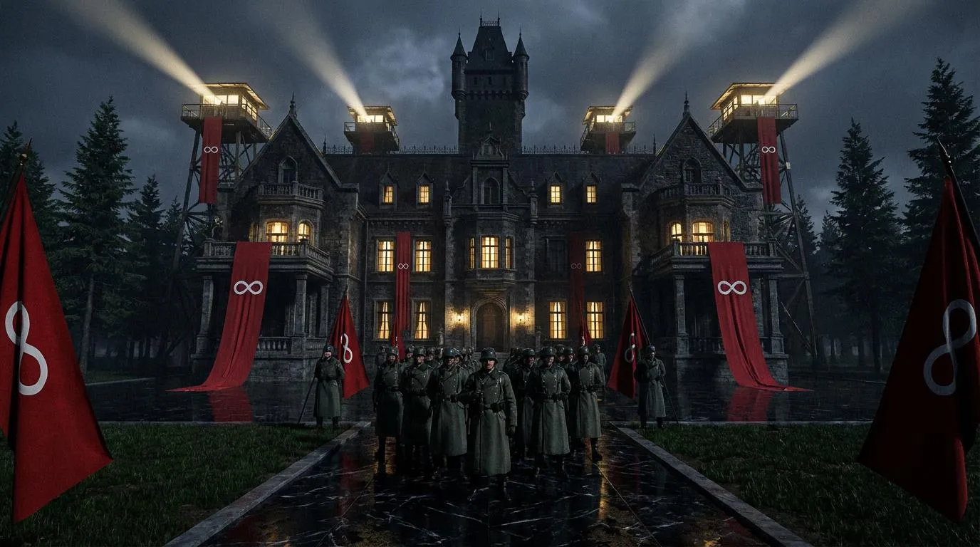 Generate haunting AI visuals: ultra-wide Gothic mansion with infinity-sign banners, sentry towers, and 1940s German soldiers on wet marble walkways. Create dramatic night scenes featuring red flags and towering architecture using vivago.ai's AI image generator tools. Transform text prompts into professional-grade dark fantasy imagery effortlessly.