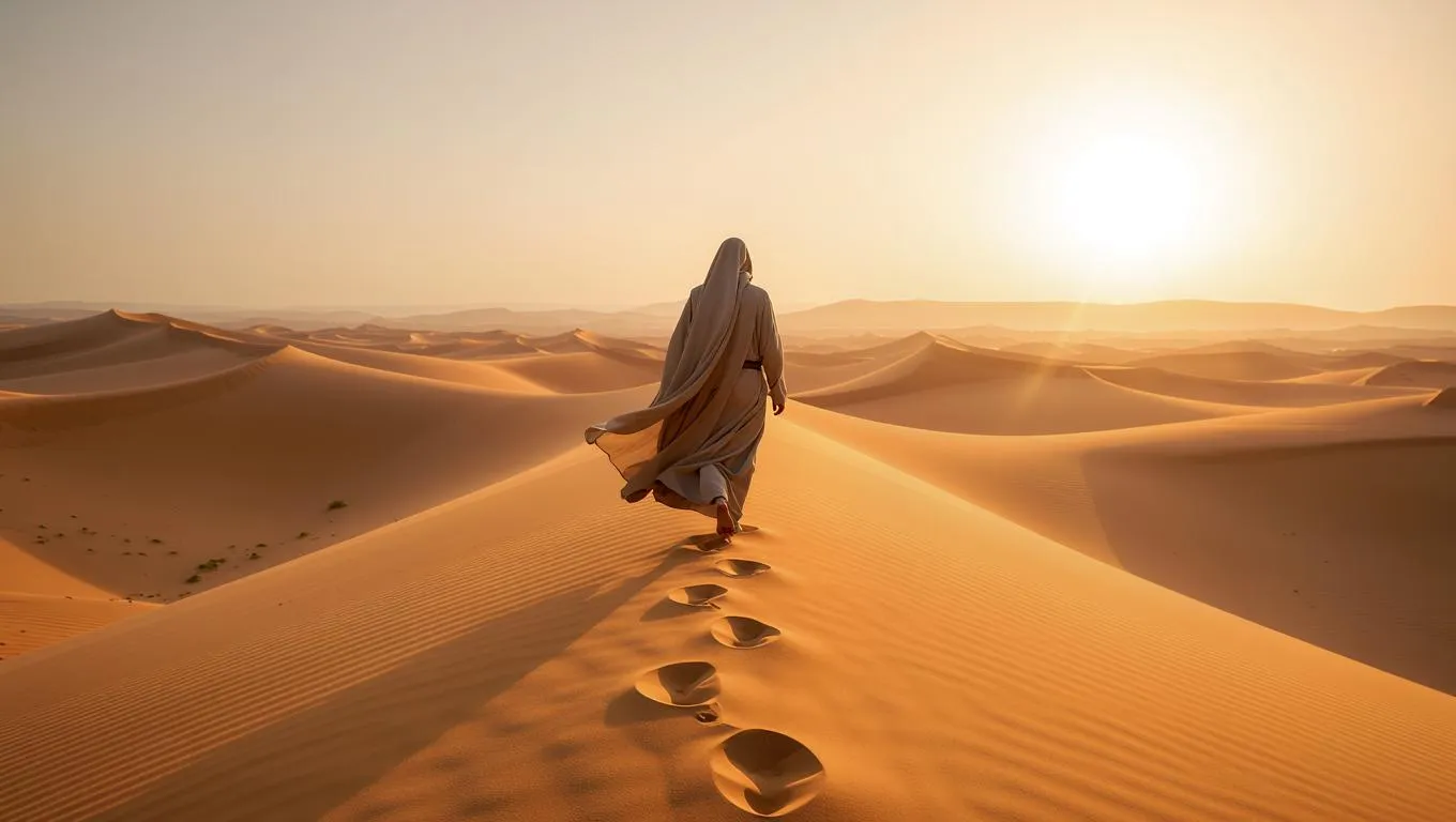 Craft cinematic hyperrealism with our AI tools. Generate a desert pilgrim's journey in photorealistic detail — glowing sand textures, soft shadows, and dynamic dunes. Perfect Hollywood-style visuals with precise grain clarity and misty horizons. Ideal for spiritual, elemental storytelling. Elevate your creative projects with Vivago.ai's advanced image generation and cinematic effects. #Realistic #Hyperrealism #Cinematic