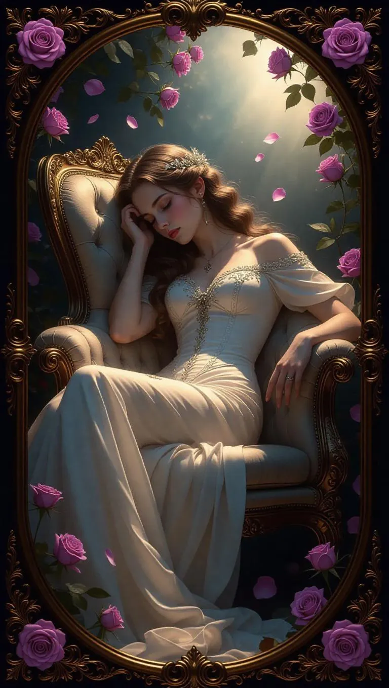 Ethereal fantasy portrait captures a sleeping princess encircled by magical roses in art nouveau style. Midnight blue, royal purple, and dusty rose hues blend with floating petals and golden light for enchanted tranquility. Create dreamy fairy tale visuals with vivago.ai's AI image generator and professional editing tools—transform prompts into captivating, ethereal scenes effortlessly.