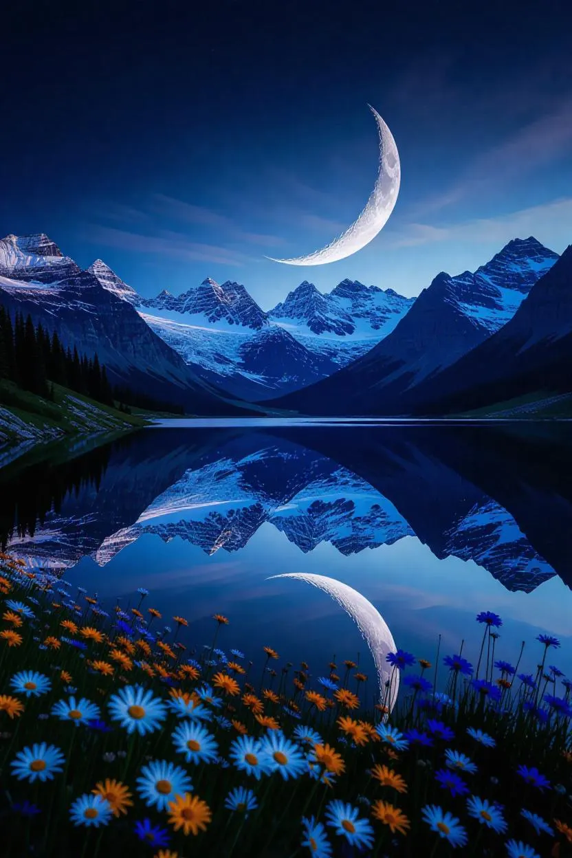 Generate a stunning surreal landscape: melting crescent moon over mountains, night lake reflecting snow-capped peaks. Crystal clear water, foreground wildflowers & cinematic Matrix code flowing from the moon. AI-generated art with vivago.ai. Transform prompts into visuals.