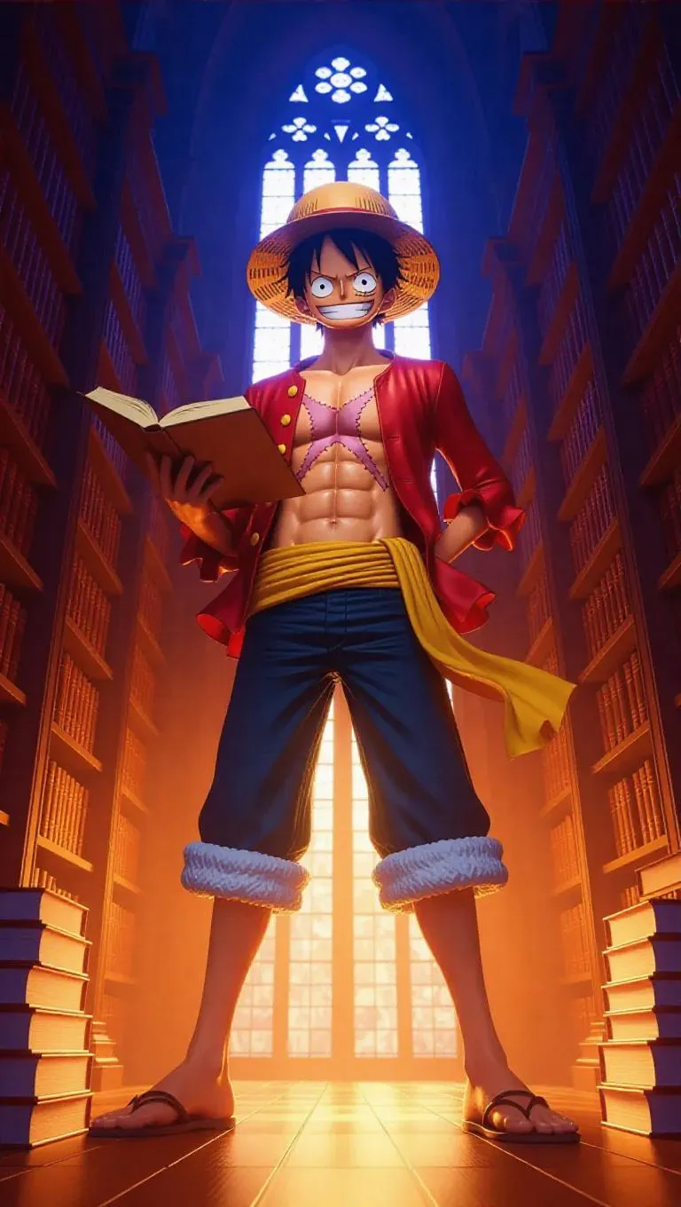 Luffy from One Piece, dressed in a casual librarian outfit, stands amidst towering bookshelves in a grand library. He is energetically organizing books, his expressive face showing a mix of concentration and excitement. The warm, ambient lighting casts soft shadows, highlighting the rich wooden shelves and the intricate architectural details. The scene exudes a cozy, inviting atmosphere, blending the whimsical charm of Luffy with the timeless elegance of a classic library. Style: Realistic with a touch of manga.