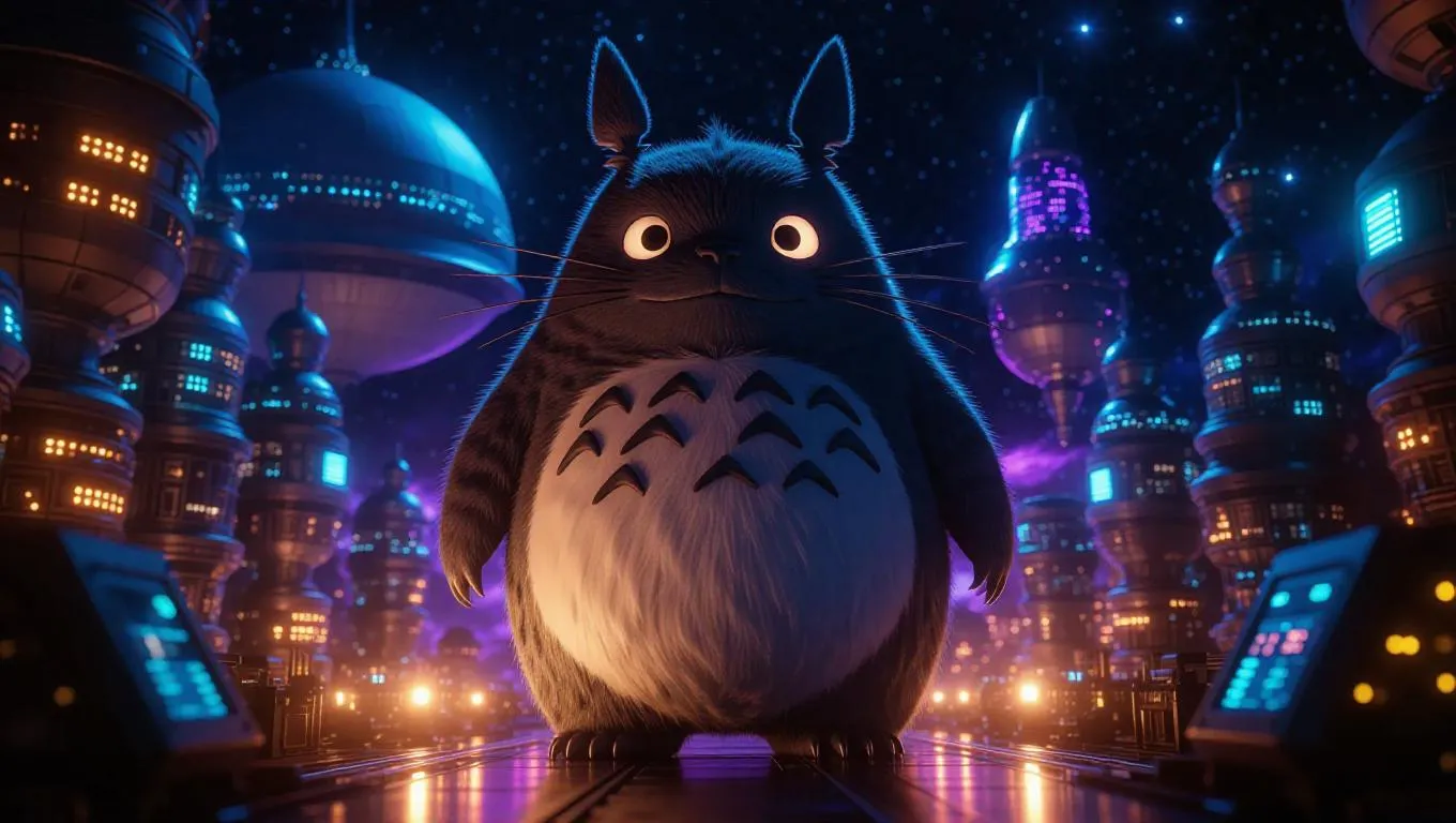 Totoro stands tall amidst a bustling space colony, his large, furry body dwarfing the shiny space shuttles. Holograms flicker around him, casting bright shadows, while colorful cosmic lights fill the scene, bathing it in otherworldly shades. Totoro's eyes twinkle with fascination, his whiskers twitching as he observes the interstellar activity. Bright, metallic light from futuristic devices highlights his gentle expression, creating a striking blend of nature and space technology. The style is a mixture of realistic and sci-fi, emphasizing the imaginative yet high-tech setting.