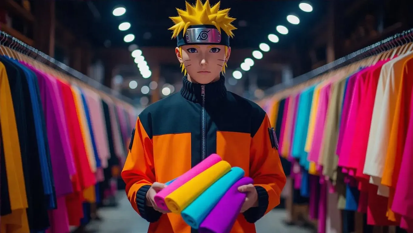 Naruto, a confident fashion designer in a stylish boutique, wears an elegant outfit and holds fabric swatches. His ninja headband has been replaced by design sketches. The dramatic spotlights enhance the fashion displays, creating a glamorous vibe, reflecting the vibrant colors of fabric, adding a chic tone to the fashion scene. The style is glamorous, capturing the creative fashion atmosphere.